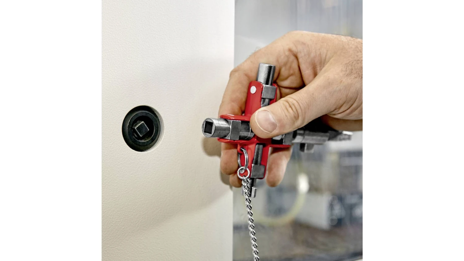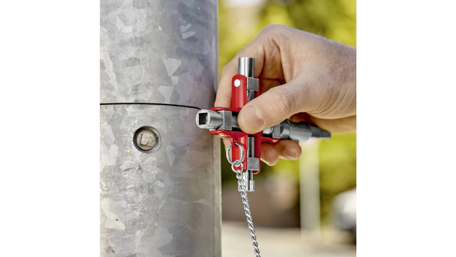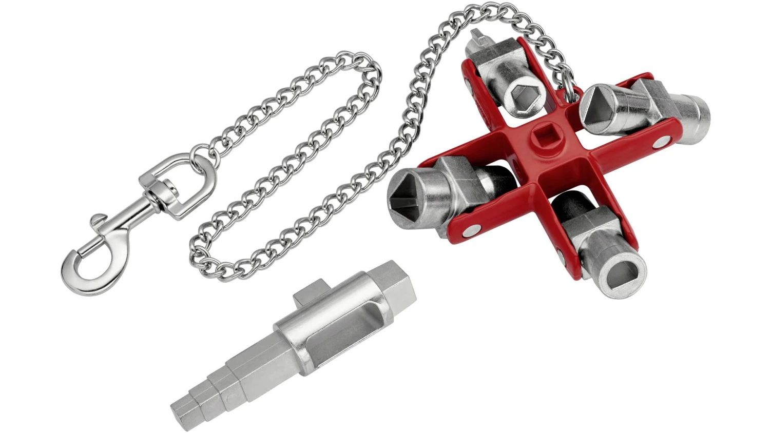 Für Schließsysteme in der Elektrotechnik, Gas- und Wasserversorgung, Klima- und Belüftungstechnik, Industrie, Gebäudetechnik usw.. Neun verschiedene Schließungen aus Zink-Druckguß in einem Schlüssel. Mit abnehmbarer Kette und Karabinerhaken. Ausführung „Bau“ mit einsteckbarem, magnetisch gehaltenem Aufsatz: Mitnehmer für Schlösser mit PZ Lochung und Stufen-Vierkant. Mit Bitaufnahme für 1/4″-Bits mit Magnet. Armlänge: 157 / 95 mm. Zink-Druckguss
