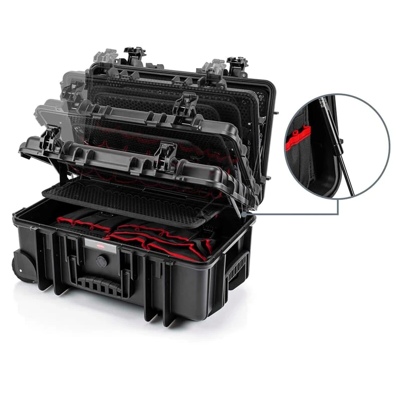 - Bestückt mit 12 KNIPEX-Werkzeugen, insgesamt 17 Markenwerkzeugen, teilweise VDE-geprüft nach DIN EN 60900