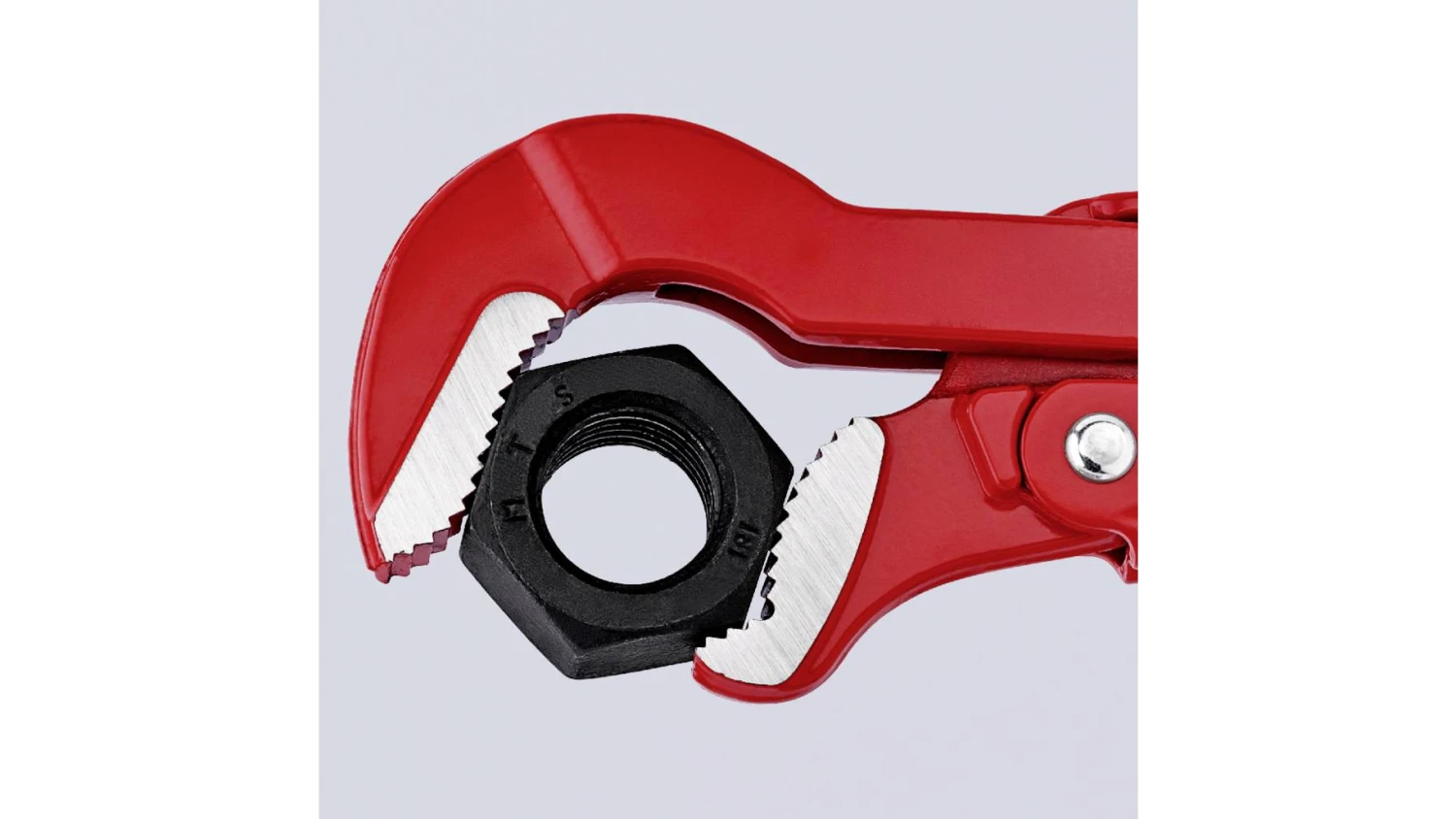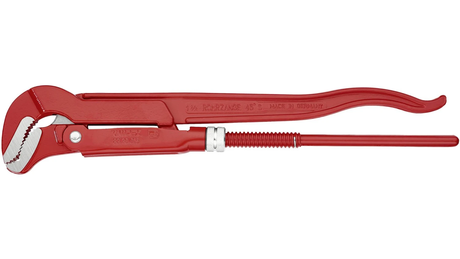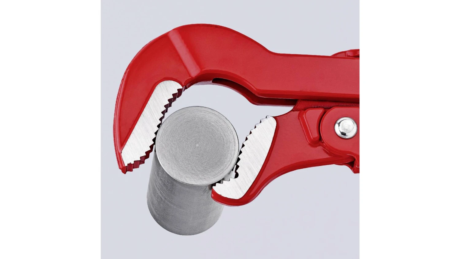 Schlankes, S-förmiges Maul. Gegen die Drehrichtung versetzte Verzahnung. Verzahnung zusätzlich induktiv gehärtet. Dreipunktanlage am Rohr, selbstklemmend. Doppel-T-Profilgriff. Unverlierbare Stellmutter. Rot pulverbeschichtet, Backen blank geschliffen. Geschmiedet. Chrom-Vanadin-Elektrostahl, geschmiedet, mehrstufig ölgehärtet