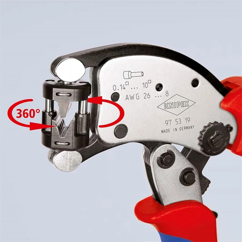 - Crimpkopf um 360° drehbar, mit 8 Rastpositionen.