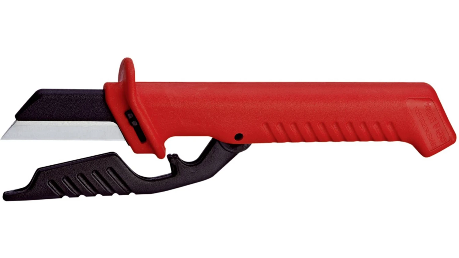 Klinge mit Spezialschliff; auswechselbar · Griff mit Abgleitschutz · stabile, feststehende Klinge mit gerader Schneide · Klingenrücken zur Vermeidung von Kurzschlüssen mit Kunststoff überzogen · mit klappbarem Klingenschutz, unverlierbar im Griff integriert · Klinge: Chirurgiestahl, rostfrei, luftgehärtet.