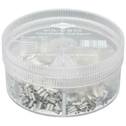 Ausführung: Aderendhülsen in durchsichtiger Streudose. Drehbarer Deckel mit Öffnung zur Entnahme einzelner Aderendhülsen.