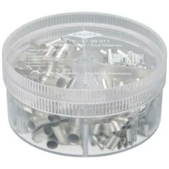Ausführung: Aderendhülsen in durchsichtiger Streudose. Drehbarer Deckel mit Öffnung zur Entnahme einzelner Aderendhülsen.
