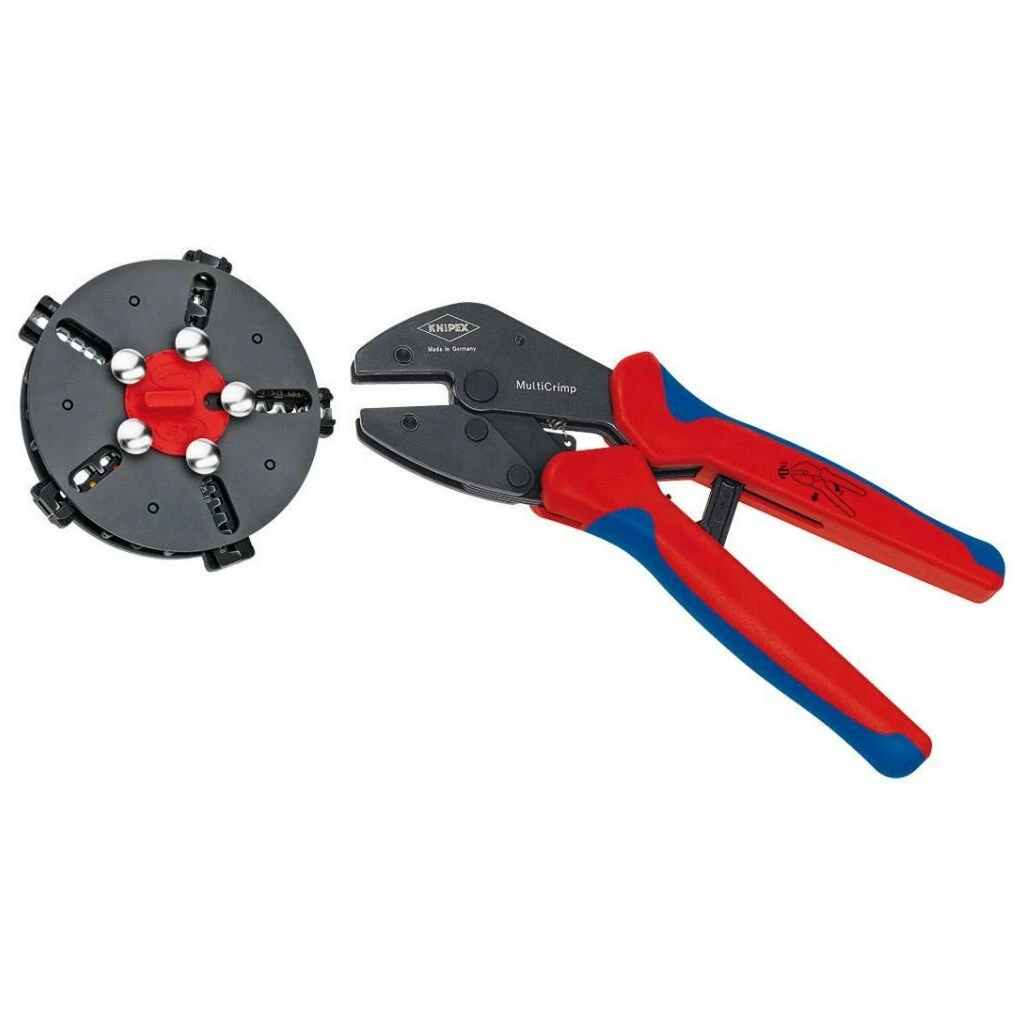 Ausführung: Alle beanspruchten Teile aus Chrom-Vanadium-Elektrostahl in Sondergüte, in Öl gehärtet und angelassen. Kopf brüniert. Griffe mit Mehrkomponenten-Kunststoffhüllen für Ein- und Zweihandbedienung. Sichere und schmutzgeschützte Aufbewahrung der Wechseleinsätze im Rundmagazin mit Gürtelclip. Hohe Crimpqualität durch Präzisionsprofile und Zwangssperre. Werkzeugloser Wechsel der Crimpprofile. Präzise voreingestellter Crimpdruck. Verarbeitung von der Seite.