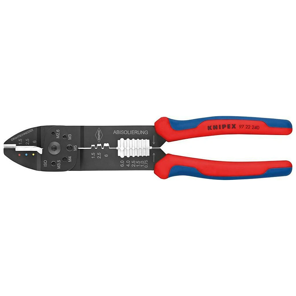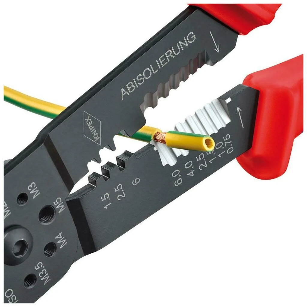 Aus Spezialstahl, schwarz lackiert. Zum Abisolieren von Drähten 0,75–6 mm² sowie zum Verpressen von isolierten Kabelschuhen und Kabelverbindern sowie unisolierten, offenen Steckverbindern 0,5–6 mm².