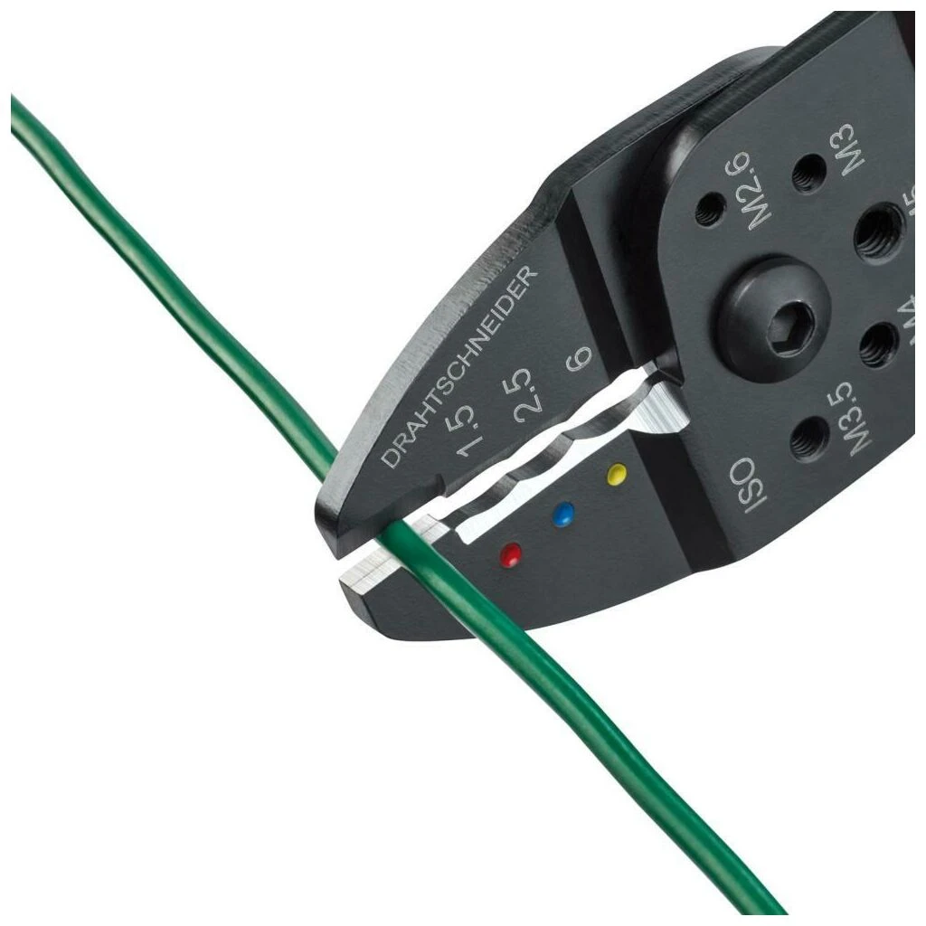 Anwendung: Zum Kabelschneiden, Abisolieren und Crimpen. Mit Abscherfunktion für Schraubbolzen von M2,6 bis M5.