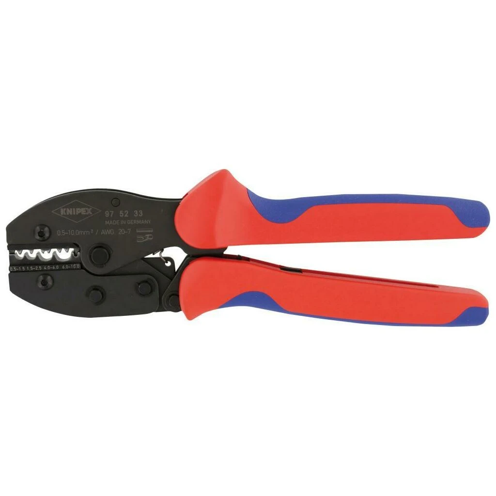 Ausführung: Aus Chrom-Vanadium-Elektrostahl in Sondergüte, in Öl gehärtet und angelassen. Kopf brüniert. Für optimale Crimpergebnisse durch Präzisionsprofile und entriegelbare Zwangssperre, Crimpdruck ist werksseitig präzise eingestellt. Hebelübersetzte Griffe mit Mehrkomponenten-Griffhüllen. Verarbeitung von der Seite.