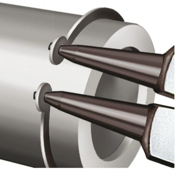 45° gebogen. Aus Chrom-Vanadium-Elektrostahl, geschmiedet, in Öl gehärtet und angelassen. Kopf poliert, abrutschhemmende Spitzen. Griffe mit Kunststoff überzogen.