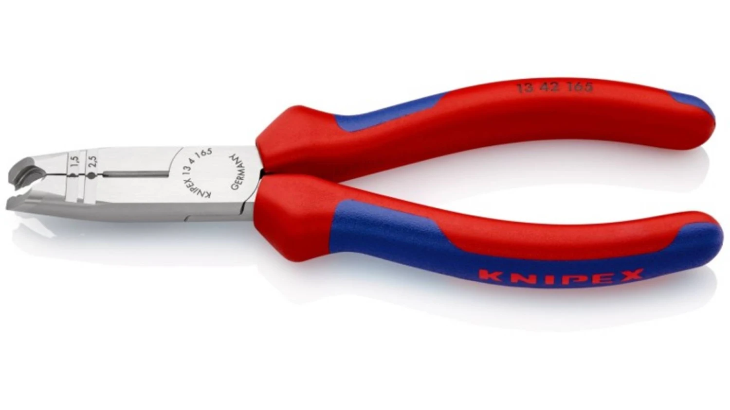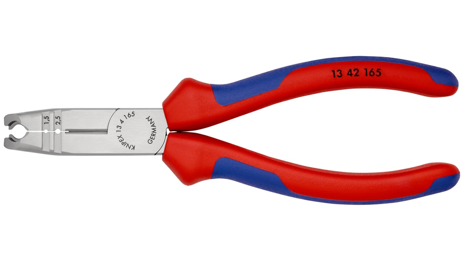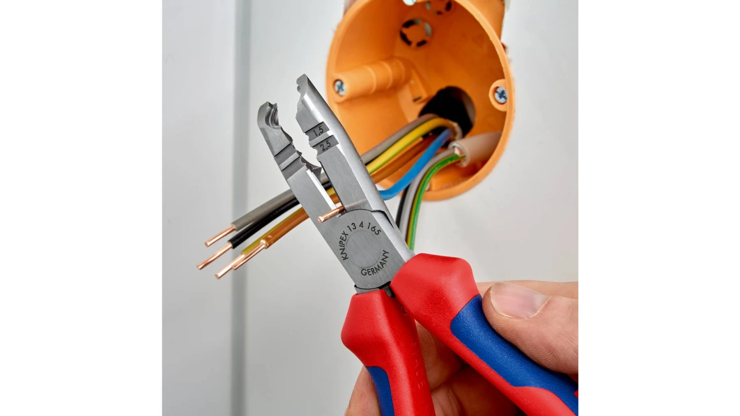 13 42 165 SB Abmantelungszange Multifunktional ¿ Schneiden, Abmanteln und Abisolieren mit einer Zange. zum zeitsparenden Abmanteln und Abisolieren von runden Mantelleitungen und Feuchtraumkabeln (z. B. NYM-Kabel). erleichterter Zugang vor allem bei tief liegenden Unterputzdosen durch schlanke Kopfform und optimal abgewinkelte Kabelmantelschneide. leicht und beschädigungsfrei Abmanteln dank Rundschneide mit Tiefenbegrenzung. Universell einsetzbar: Präzisions-Abisolierlöcher für Leiter 0,75 – 1,5 und 2,5 mm². Mit Seitenschneider zum Schneiden von Leitern, Drähten, kleinen Schrauben und Nägeln. Alle Schneiden zusätzlich induktiv auf ca. 61 HRC gehärtet: für hohe Verschleißfestigkeit. 30 % geringeres Gewicht als vergleichbare Zangen. SB-Karte/Blister. – Schneidwerte mittelharter Draht (Durchmesser): Ø 3,2mm – Schneidwerte harter Draht (Durchmesser): Ø 2,2mm – Abmantelungswerte (Durchmesser): 8 ¿ 13mm – Abisolierwerte Quadratmillimeter: 0,75 ¿ 1,5mm² / 2,5mm².